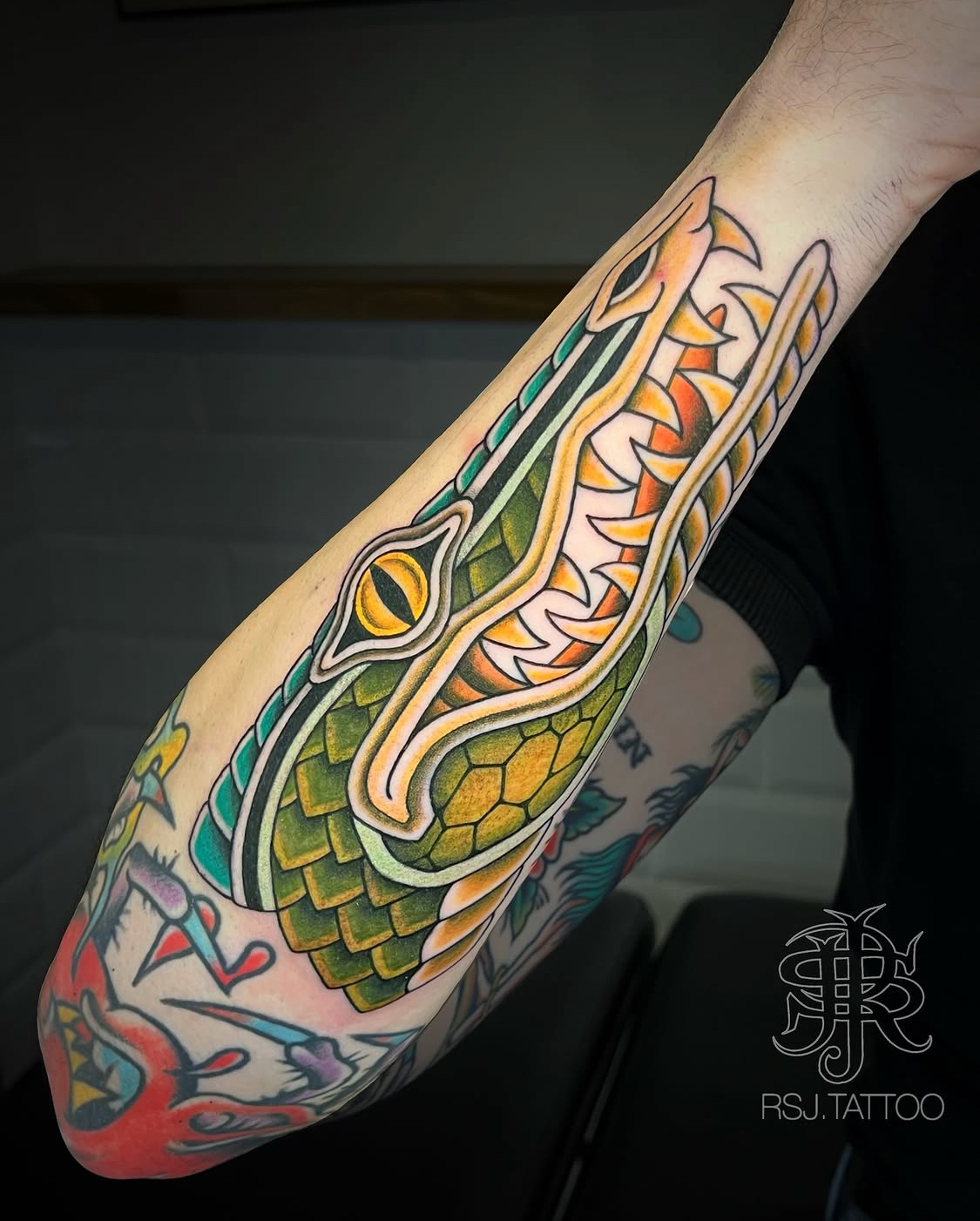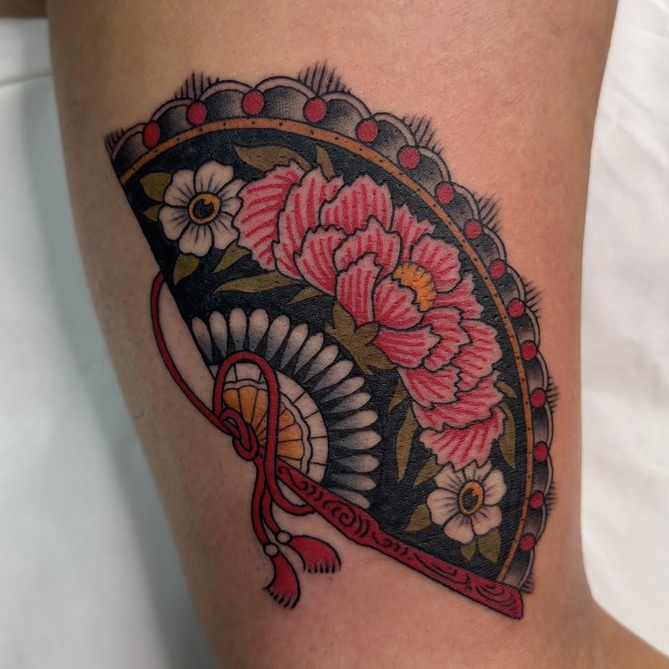 El tatuaje tradicional se basa en unas normas muy claras: líneas firmes, paletas de color limitadas y composiciones equilibradas. Rojo, azul, verde, amarillo y negro son los protagonistas, siempre aplicados con intensidad y precisión.